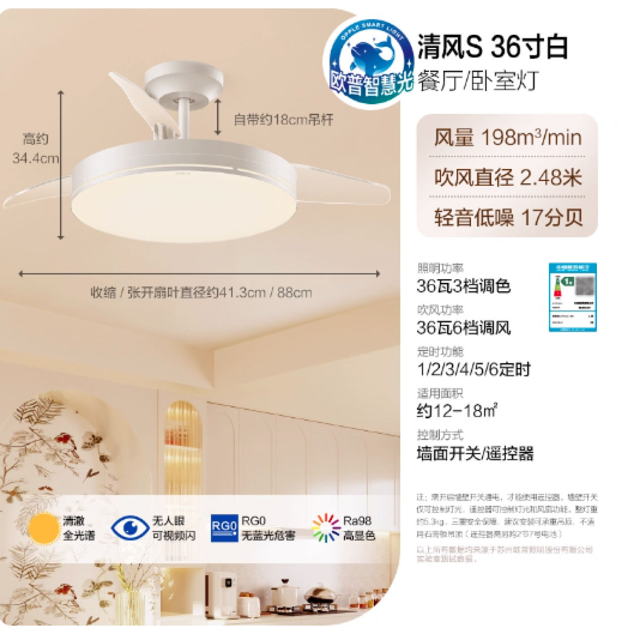 欧普照明智慧光隐形风扇灯简约全光谱卧室餐厅吊灯客厅吊扇灯36寸36瓦 白